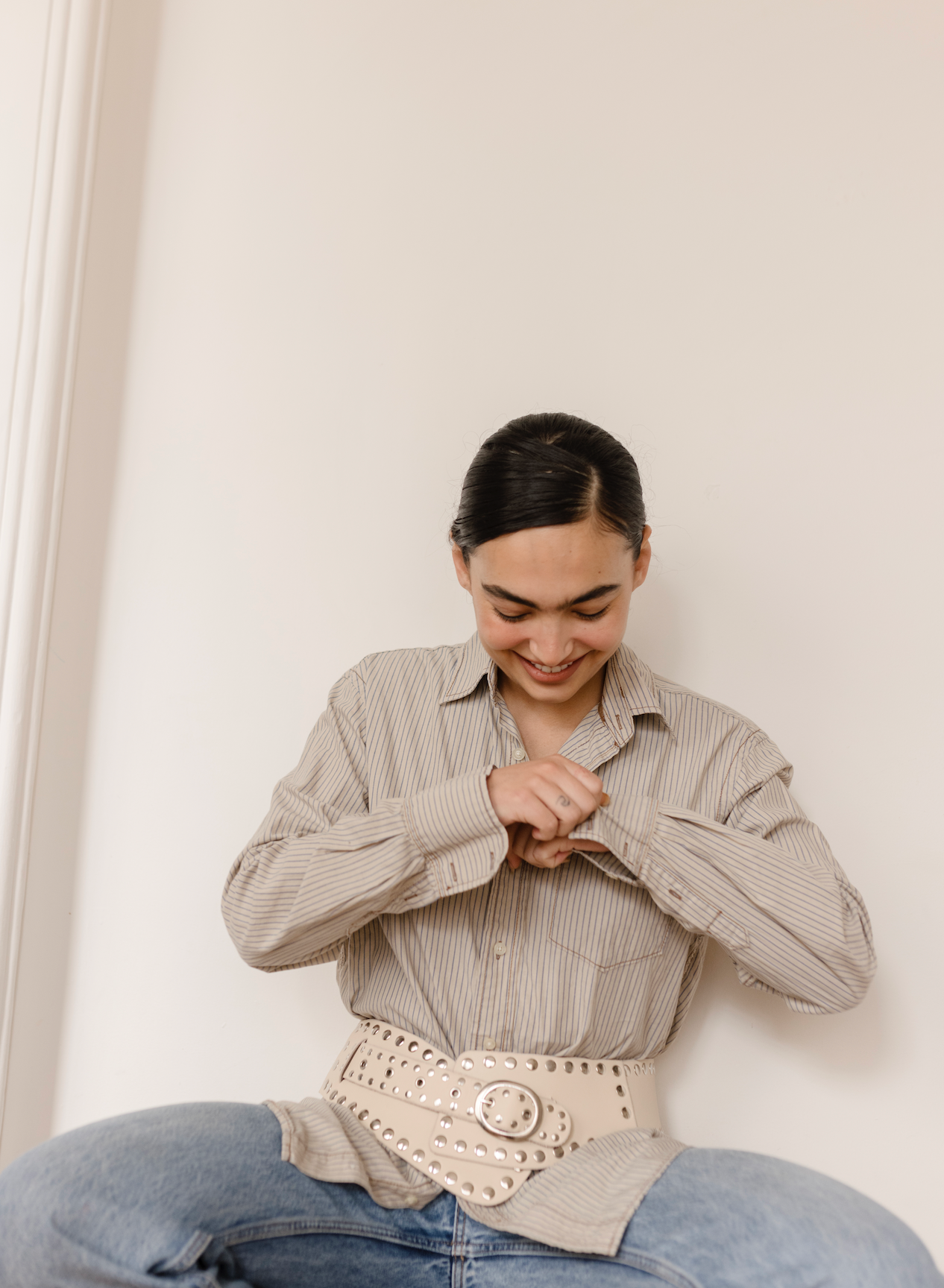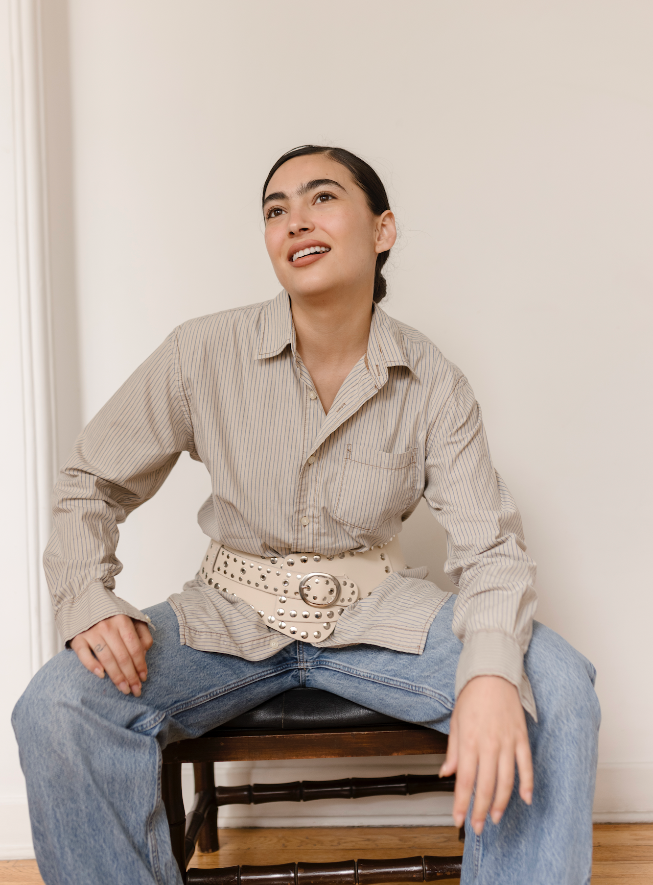 El cinturón está hecho a mano por el maestro Ulises, utilizando piel mexicana. Todos los accesorios de talabartería provienen de un negocio familiar establecido en el centro de la ciudad desde 1940.